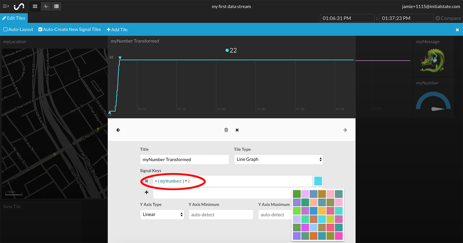 Not only are all historical values of myNumber transformed by the expression in this new tile, as new data is streamed in the transformation will update in real-time. Real-time expressions give you a powerful tool for doing some really useful data transformations including unit conversions, filtering, mapping data values to emojis, and so much more. Read more about real-time expressions here.