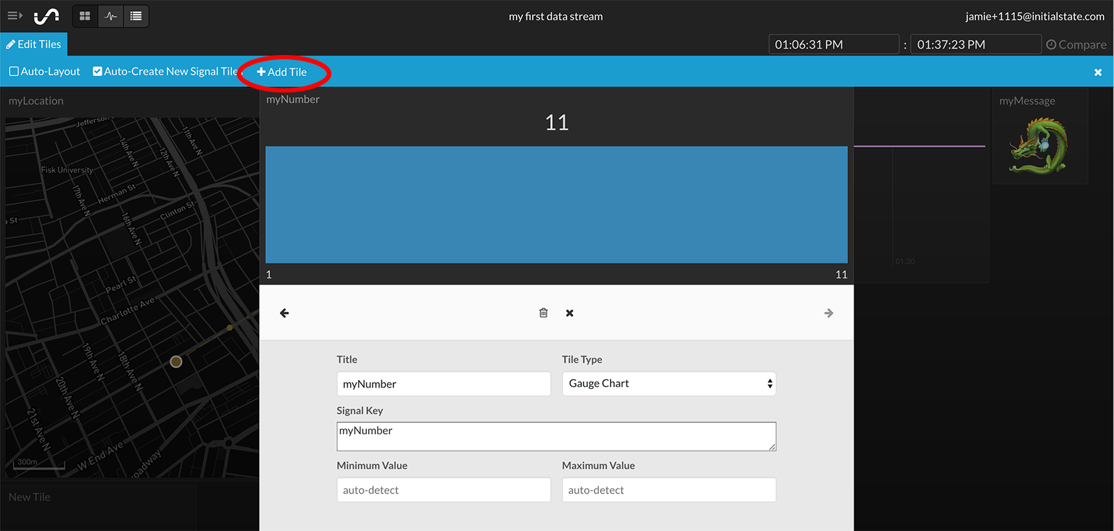 You can add as many tiles to your dashboard as you want, including multiple, different views of the same data stream. Click the "+Add Tiles" link at the top to add a new tile. Set the tile title in the Title field, the type of tile in the Tile Type field, and the data source in the Signal Key field. For example, choose the myNumber data stream as the Signal Key and select Gauge Chart from the Tile Type list.