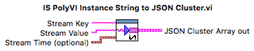 All data needs to be packaged into the JSON Cluster Array. This VI is a PolyVI with three polymorphic instances. Each instance accepts different data types for the data to send to Initial State - aka Stream Value. The Initial State API accepts strings, numbers, and booleans, so we have created those instances for this example. Ultimately, everything is flattened to a string, so you can create your own instances to convert your data to a JSON cluster.