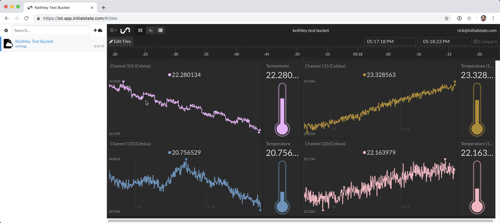 Once you click through Bucket Name and Key, the preconfigured scan will automatically start. Now is the time to log in to your Initial State account and see your new data coming in. You can log in from anywhere including your phone. Initial State graphs will update in real-time. You can rename the bucket if you like, start creating a dashboard, or create derived signals from math expression on the data. All of these configurations will be respected as new data comes in. Perhaps you are doing measurements that take hours or days. Check in on things to see from the comfort of your couch at home while watching Netflix :).
